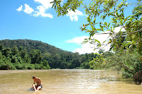In the central flow it was possible to get carried down over the small rapids before swimming back to the edge and returning to our sand bank. I sunbathed on a large log caught in mid river and wandered what the Malaysians, passing occasionally in boats, were thinking, seeing us here in the middle of nowhere lounging in the river.